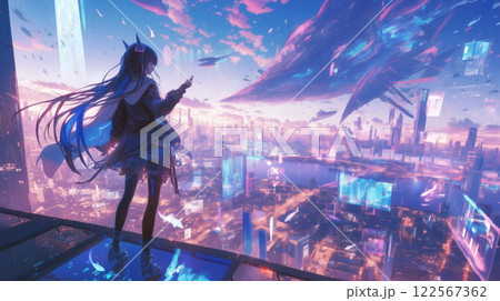 未来都市を見つめるアニメ風のサイバーパンク少女