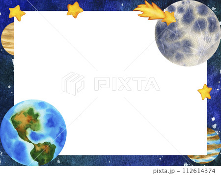 Frame Galaxy with Earth and Planets of our solar system. Moon in Space. Planetarium clip art. Watercolor Illustration of outer space with stars