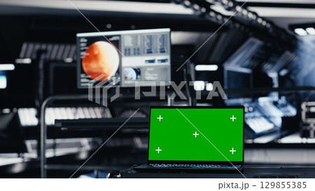 Mockup notebook used for orbital navigation data in cockpit during red planet journey. Green screen laptop used for operating spacecraft control interface next to monitor displaying Mars dashboard