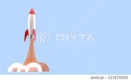 Retro cartoon rocket launching with smoke trail and bright flames, symbolizing futuristic space exploration on blue gradient background