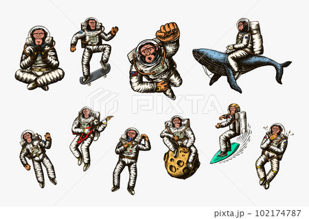 Monkey astronaut with whale, guitar, skateboard and moon. Chimpanzee spaceman cosmonaut characters