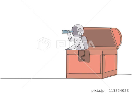 Single one line drawing astronaut emerges from the treasure chest looking for something with binocular. Get lots of valuable materials to observe on earth. Continuous line design graphic illustration