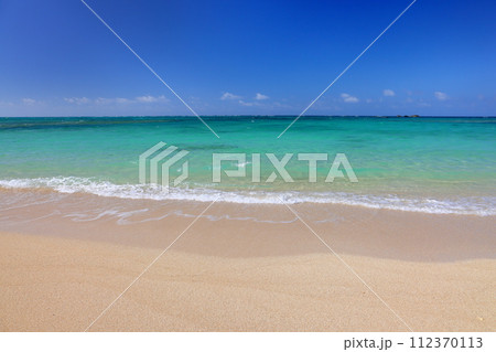 晴れた日の沖縄県読谷村の宇座海岸の白い砂のビーチと波打ち際