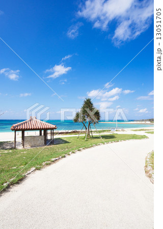 晴れた日の沖縄県読谷村の宇座海岸のビーチ沿いの遊歩道と赤瓦の東屋