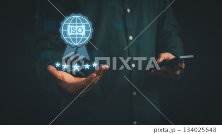 Businessman holding digital ISO certification icon with five-star rating, symbolizing international standard, quality assurance, compliance, trust, and business excellence in professional management.