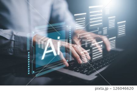 Programmer people working laptops with AI, artificial intelligence software engineer coding on laptop computers with technology icons and binary code, big data, Ai bot digital machine