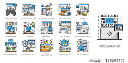 Web development color line icons. IT specialist, career and job vacancy vector symbols of programmer, tester, game, software and app developer, system administrator, data engineer and UI designer