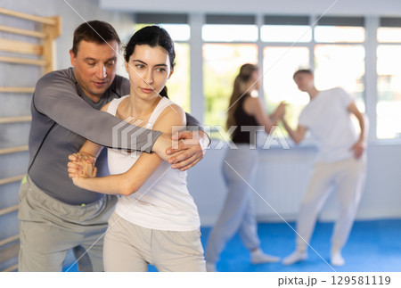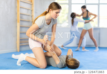 白背景の警棒を構える若い女性警備員 撮影協力:学校法人電波学園 東京電子専門学校