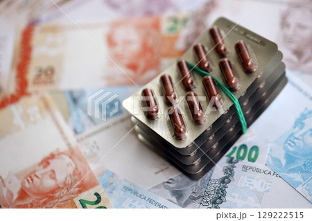 Brazilian reais banknotes and medicine pills. Brazil real money and drugs lies on table