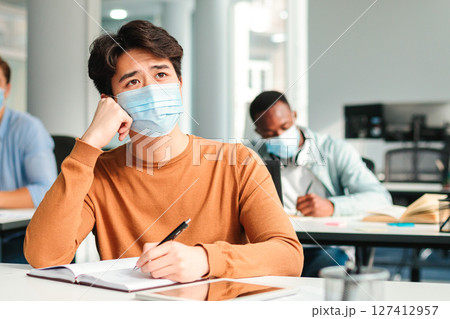Modern Education Concept. Portrait of pensive asian student sitting at table in classroom at college, wearing surgical medical mask, writing in notebook and thinking, looking aside. Banner, free space