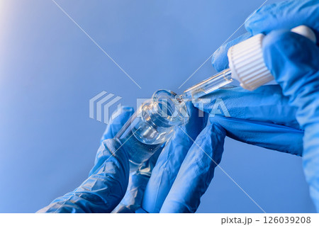 Preparing a solution using a dropper and vial in a laboratory setting with a focus on precision and safety