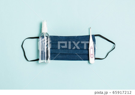 Top view of handmade cotton mask, alcohol hand