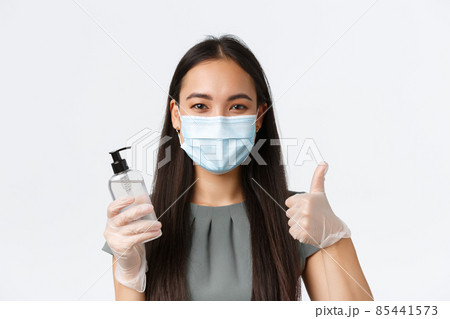 Small business owners, covid-19, preventing virus measures concept. Close-up of asian businesswoman in medical mask and gloves showing thumbs-up and hand sanitizer over white background