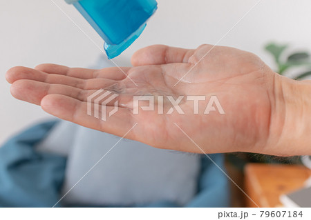 Close up of dropping alcohol gel into a hand.