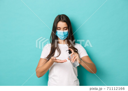 Concept of coronavirus, health and social distancing. Portrait of pretty brunette girl in medical mask, applying hand sanitizer on hand, standing over blue background