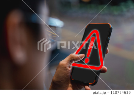 man using smartphone with notification error. warning sign over on mobile phone.