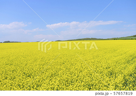 一面の菜の花畑とトラクターに引かれた幌馬車