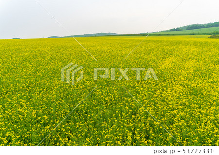 一面の菜の花畑とトラクターに引かれた幌馬車