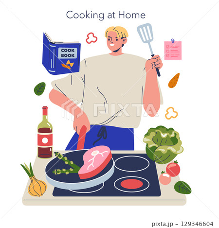 Vector illustration of a person preparing a steak on a stovetop. Surrounded by vegetables, a cookbook, and wine, the individual appears content and focused while cooking.