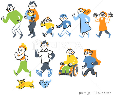 社会と共生 社会に生きる様々な人々が歩い前進しているセットのストックイラスト素材