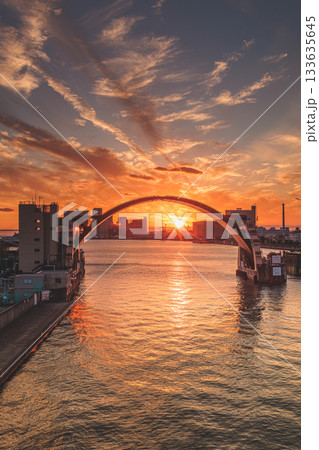 アーチ型水門越しのUSJホテルと日の入り