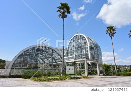 のんほいパーク(豊橋総合動植物公園)の温室と晴天の空