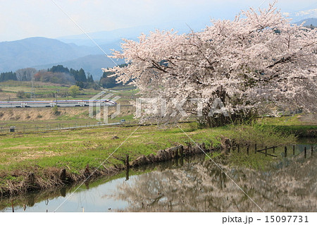 桜花咲く池と山形新幹線