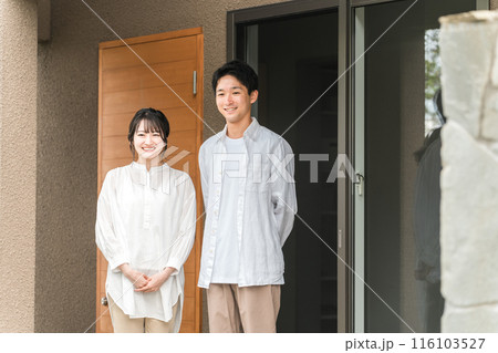 新築のマイホーム・一軒家・一戸建ての玄関の前に立つ施主の夫婦・カップル・家族