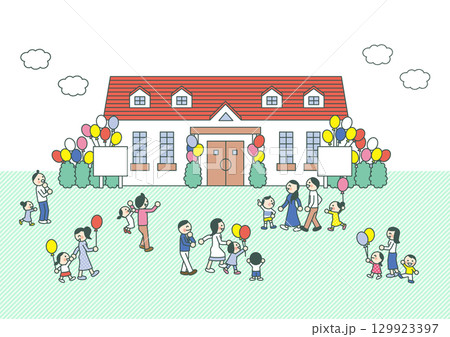 住宅メーカーのオープンハウスイベントで風船を持って集まる親子のイラスト