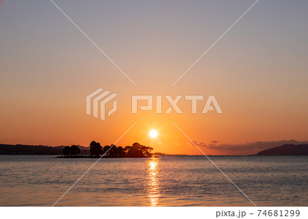 宍道湖の夕焼けと嫁ヶ島と袖師地蔵の風景 島根県松江市