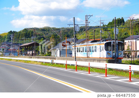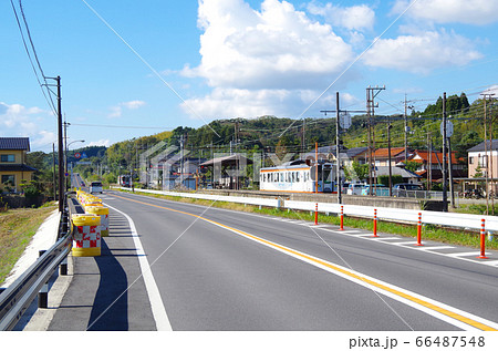 宍道湖沿線の国道沿いを走る一畑電車とレトロな駅のホームが見える長閑な風景 … 島根県 松江市(晴れ)