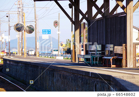 宍道湖沿線の国道沿いを走る一畑電車のレトロな駅のホーム … 島根県 松江市(快晴)