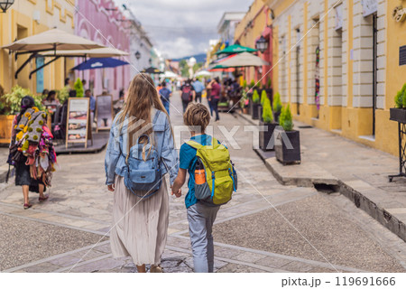 Mother and her son tourists walks through the colonial streets San Cristobal de las Casas, Mexico. Cultural exploration, architecture, and travel experience concept
