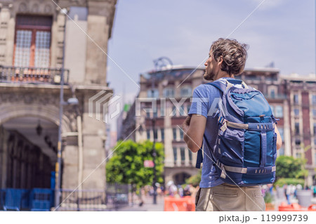 Male tourist in the central square of Mexico City, Zocalo. Cultural exploration, travel, and historic architecture concept