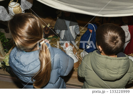 A child praying near a Christmas nativity scene with baby Jesus Creche Figurines