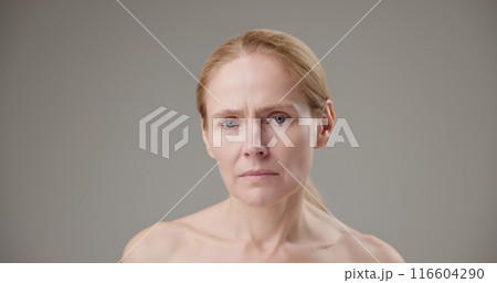 Real people - age, beauty, health and dry skin care concept - beautiful mature Caucasian middle aged woman in her 50s in a bad mood, upset and exhausted