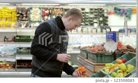 Man choosing bell pepper and fresh vegetables at the grocery store, surrounded by vibrant options for a nutritious diet. Everyday grocery shopping scene. shelf with vegetables