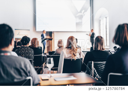 Interview and round table discussion at business convention and presentation. Audience at the conference hall. Business and entrepreneurship symposium.