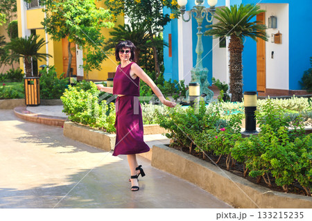 A woman in a beautiful cherry-colored dress walks dancing through a neighborhood with expensive houses
