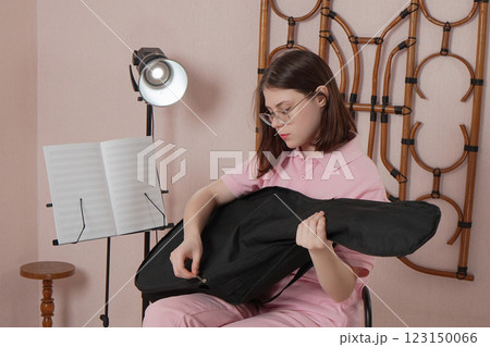 Woman guitarist removes guitar case from acoustic guitar. Female musician practicing in home studio