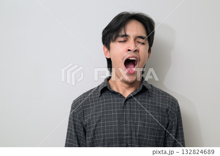 Portrait of handsome Young Asian Thai man yawning while tired against white background