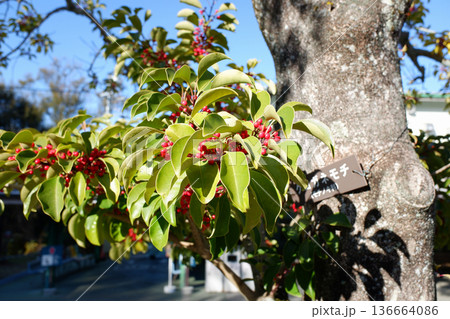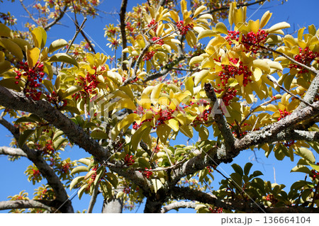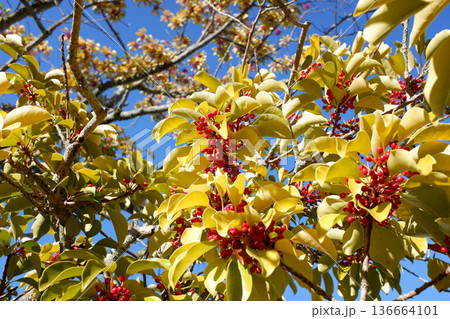 青空とイイギリの赤い実(冬の日差しを浴びた南天桐)