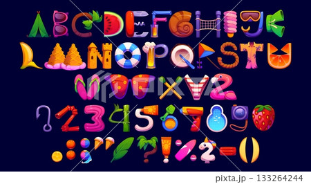 Travel vacation font, summer typeface, tropical type, English alphabet letters, numbers and symbols with beach items, fruits, toys, sunglasses, palms, slippers and sandcastles. Vector cartoon kids abc