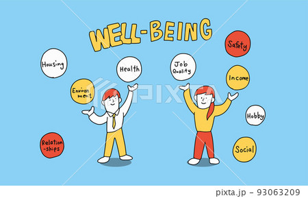 Well-being ウェルビーイングについて考える男女の学生またはビジネスマンのイラストレーション