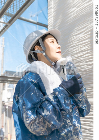 夏の現場の熱中症対策:作業の合間に水分補給をして汗を拭う女性職人