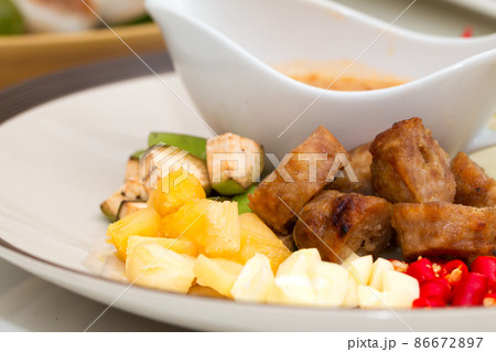 Close up of Namnueng with sliced banana pine apple chilli and dipped sauce on white plate