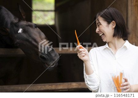 馬に人参をあげる女性