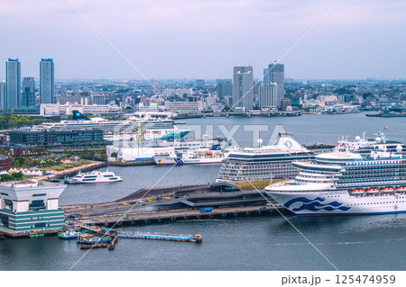 日本の横浜都市景観2隻の豪華客船。ノルウェージャン・スピリットやクイーン…、ぷかりさん橋などを望む