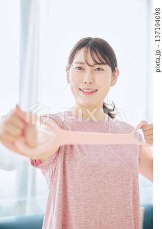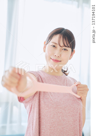 トレーニングチューブで腕のエクササイズをする健康志向の女性