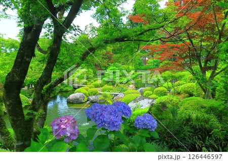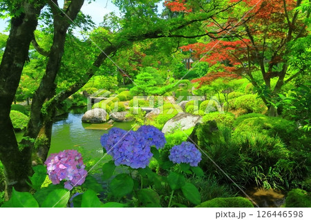 宇治市 三室戸寺庭園散策路と池泉と紫陽花と新緑